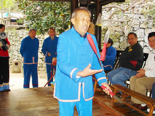 打三棒鼓的技巧性很強,思想要高度集中,拋刀拋棒用力要適度,動作要敏捷準確,稍有疏忽大意,不但表演失敗,還會被刀劃破手腳或誤傷他人。因此,凡是學打三棒鼓者,均需經(jīng)常練習飛拋接技術,做到閉目均能拋接刀棒。因此,土家族青少年經(jīng)常用三個卵石練習拋接技術,久而久之,熟能生巧,不但會拋棒,而且能拋刀。