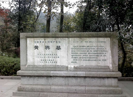 在岳麓山上。墓由三層臺(tái)階百余級(jí)踏步導(dǎo)入,墓碑為一四棱形的整塊4乳白色巖石琢成,全高約10米,因地處岳麓山高峰開(kāi)闊處,顯得格外聳拔、挺秀、眺望湘江江,長(zhǎng)沙景物盡入眼底。黃光(1874—1916),朱名軫,號(hào)杞園,又號(hào)克強(qiáng),湖南善化(今長(zhǎng)沙)人,辛亥革命重要領(lǐng)導(dǎo)人,史有“孫黃”之稱。1904年組織華興會(huì),翌年8月與孫中山、章太炎等人組織中國(guó)同盟會(huì),曾生動(dòng)并領(lǐng)導(dǎo)欽州、廉州(治今廣西合浦)、鎮(zhèn)獻(xiàn)花(今友誼關(guān))、河口、廣州等地區(qū)反清戰(zhàn)役起義,任民軍戰(zhàn)時(shí)總司令。南京臨時(shí)政府成立,任陸軍總長(zhǎng)。袁世凱稱帝后,任討袁軍總司令。1914年赴美醫(yī)病,1916年病重回國(guó),10月31日于上海病故,時(shí)年43歲,次年移柩長(zhǎng)沙,國(guó)葬于岳麓山。為全國(guó)重點(diǎn)文物保護(hù)單位。