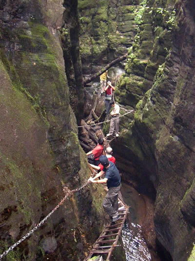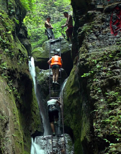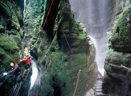 坐龍峽擁有中國第一條特種游道。所有游道均建于峽谷深處,依山取勢,既經(jīng)細(xì)心雕琢聽卻又渾然天成。粗樸的板栗木棧道,可以讓你零距離的親近那一潭碧幽、聽聞山泉叮咚;精巧的跳墩,可以讓你媳戲流泉、觸感溪瀑;原質(zhì)的石坎道,讓你不得不調(diào)動(dòng)全部的身心能量悉心攀援、感悟峽谷;有驚無險(xiǎn)的鐵梯,讓你伴著腳下轟鳴的溪水,在驚怵中體味一份快慰。出口處的土家山寨,保留了古樸獨(dú)特的生活習(xí)俗。一塊臘肉就一口醇香的“苞谷燒”會讓你洗去所有的疲憊,在輕松中憨厚的主人向你講述過去強(qiáng)人出沒的故事......
