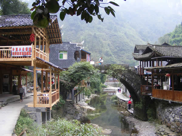 德夯風(fēng)景區(qū) 德夯景區(qū)古風(fēng)猶存,人文景觀眾多,景區(qū)到處都呈現(xiàn)著遠(yuǎn)古文化風(fēng)貌,苗寨依山而建,飛檐蹺角,半遮半掩,封火墻、雕花窗,造形奇特,格調(diào)鮮明,色彩分逞,豐富多彩,無不顯示出遠(yuǎn)古遺民的氛圍。田野里,溪河傍,終日旋轉(zhuǎn),人們用他碾米或加工紙漿,碾盤時(shí)時(shí)發(fā)出“哐鐺、哐鐺”石頭撞擊聲,以示古代文明。人們用原始的方法造紙、織布、染布、榨油。用厚重的木船擺渡,索索船隨處可見。人們在集上進(jìn)行交易,量具多使升、斗器具,買賣雙方在衣角內(nèi)摸手講價(jià)。景區(qū)苗民許多習(xí)俗稀奇古怪,難以用語言敘述。這里的一切都顯示著原始古老,與大山外面的現(xiàn)代城市形成了鮮明對(duì)照,因此,聞之而來的旅游者、古文化研究者紛至而來,絡(luò)繹不絕,探索者成千上萬。