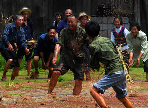 插秧活動的最后一天,叫做“關(guān)秧門”。一丘田里,聚集了很多幫忙插秧的人,大家心里都憋著一股勁,看誰秧插得最快。速度慢人往往會被插得快的人圍住,最后關(guān)在秧田中間出不來,這叫“關(guān)豬籠”。這時(shí)候,速度快的人就會走上田埂,抓起稀泥團(tuán)朝被關(guān)了豬籠的人扔去,也有專門砸主人一身稀泥的,岸上也有人澆水。主人身上被砸的稀泥越多,主人越高興。在關(guān)秧門的最后時(shí)刻,人們會在田野里上演一場你追我趕的游戲,土家人把它叫做“糊倉”。在“糊倉”的過程中,誰也不會記仇,大家你追我趕,場面極其熱鬧。