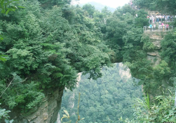 在砂刀溝盡頭右側(cè),袁家界左面南沿,一天然石橋凌空飛駕于兩座巨大的石峰之巔,厚約4米,寬2米余,跨度約50米,相對(duì)高度400多米。橋面兩端石峰上,綠樹(shù)叢簇,郁郁蔥蔥,峰壁則宛若斧劈,草木不生。立橋邊俯視,透過(guò)稀疏樹(shù)葉,見(jiàn)云涌霧蒸,幽深莫測(cè)。自北端步行過(guò)橋,狹窄處僅數(shù)十厘米,心驚卻步。繞過(guò)深谷,站在相距40多米處觀橋臺(tái)上,橋的全貌映入眼簾,橋身雄奇?zhèn)グ丁?