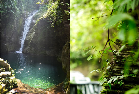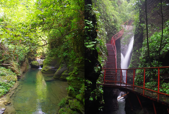 十八潭總名。稍作休憩,我們開始奔赴東線的景點。東線主要是以十八潭為主,下游有4潭:合潭、梳妝潭、魚潭、黑潭;中游有9潭:換衣潭、美人潭、石蛙潭、姊妹潭(3個)、情侶潭(2個)、二龍搶珠,上游有5潭:鬼谷神功(2個)、幽潭、落銀潭(彩虹潭)、路邊潭。十八個潭深淺不一,淺則1米以上,深則4米左右,形狀各異,有的月牙形,有的豬腰狀,形狀不規(guī)則,石壁上水沖成潭,真是鬼谷神功,此處水質(zhì)細(xì)膩,加之綠林映襯,水色碧綠見底,猶如十八顆翡翠石鑲嵌在山林之間,涓涓溪流晶瑩剔透,飛流直下的瀑布,氣勢磅礴,蔚為壯觀, 下游的4潭,合潭、梳妝潭、魚潭、黑潭。合潭是仙女峽谷與十八潭的交匯處;梳妝潭的水清如明鏡,又因為潭兩側(cè)石頭的封閉,使這面鏡子靜止不動,很方便梳妝,照鏡子。在梳妝潭周圍,有一種植物屬于紅豆杉系列,它的形狀好似梳子,可以用來梳頭。魚潭可不能望文生義。魚潭,是在冬天的時候,所有的魚都聚集在這里過冬,除此之外,這個潭水淺見底,冬天魚苗聚集,是捕魚的好季節(jié)。黑潭,水深不見底,所以叫黑潭。現(xiàn)在已經(jīng)看不見梳妝潭、魚潭、黑潭了,你猜為什么?建水庫,建水上樂園,淹沒了。 斷魂石的傳說。三國時期,高氏和蕭氏一對夫妻春節(jié)忙活,遇上了天門垮眼,受余震襲擊,打死了丈夫蕭氏。高氏思念丈夫,淚哭不斷,結(jié)果摔死潭中。人們經(jīng)常還能聽到哭聲傳來,不敢單獨行走,需成群結(jié)隊。后人為了鎮(zhèn)邪,雕刻一條蜈蚣驅(qū)趕哭魂,多年后,蜈蚣成精,天上打雷,巖石發(fā)光,遭雷所劈,成了斷魂石。 和尚姥,也就是丹灶峰,天門十六峰之一。相傳此峰為仙人化身,赤松子曾在此煉丹,許多詩人在此留下了美妙的詩篇,明代葉守禮《丹灶峰》: 懸崖峭壁隔塵寰,上有仙人學(xué)煉丹。 煉得丹成鶴已去,獨留丹灶在峰巒。 意思是說,在這險峻秀麗的山峰上,赤松子潛心煉丹,不受塵世干擾,身心沉醉于秀美的山間,沉溺于丹藥的煉制之中。作者很是羨慕那種與世隔絕的超脫,那種執(zhí)著于自我理想的瀟灑,你羨慕不羨慕? 竹林叢生。我們要學(xué)習(xí)竹子的精神,中空、謙卑;我們要學(xué)習(xí)竹子的精神,抱團生長;我們要學(xué)習(xí)竹子的精神,破土而出,節(jié)節(jié)高。 向家塔。打造農(nóng)耕養(yǎng)生游的地方。種田、種菜、種花,農(nóng)家餐館。 爛泥巴根。爛泥巴根和馬桑樹是同科,是這里獨特的一種樹。馬桑樹亦稱“千年紅”、“馬鞍子”,屬落葉灌木,馬桑樹多枝叢生,一簇一簇的,枝葉像傘蓋,因此“馬桑樹兒搭燈臺”。春風(fēng)一吹,滿山的馬桑樹、爛泥巴根就吐翠滴綠,顯示出強勁的生命力。打油詩一首: 青青枝條四方走, 肥肥大葉落上頭, 身在路邊無人問, 冬去春來樂悠悠。 秋天死亡,春天長勢更加茂盛,它的新生是通過死亡實現(xiàn)的。山川如此,植物也是如此,這里的一草一木無不透露著道家那種齊生死、等貴賤的精神。 這叫“常道”亭,“道可道,非常道”,據(jù)說是白狐與劉海相遇的地方。吊橋。 十八潭各具特色。 中游有9潭。第五潭叫換衣潭。巖石聳立,霧氣氤氳,巖壁上布滿水汽,猶如雨下。又因過道狹窄,行人需彎腰通過,未免雨水打濕衣裳,在此就要脫下身上衣物,通過后在第六潭再穿上。因此第六潭又叫美人潭,很幽深神秘的。第七潭叫石蛙潭,水淺,又比較平穩(wěn)、安全,春天產(chǎn)籽。余音回響,猶如蛙鳴,給人“聽取蛙聲一片”的錯覺。 對面巖壁叫“臘肉鋪”,那條自上而下的溪流叫“酒長流”,客人來了,咱土家人熱情,臘肉下炕,苞谷燒,喝兩口! 第八潭第九潭叫情侶潭,比較隱蔽,他倆靜悄悄地談著情話,我們快走,不要打攪他們。 第十潭、十一潭、十二潭叫姊妹潭。下面那個,水淺淺的,溫溫的,是幺妹潭,中間那個是二哥潭,上面那個是大哥潭。 潭的旁邊有珍稀植物馬蘭花,馬蘭花又名蝴蝶花、蝴蝶蘭,為多年生宿根草本花卉,根莖短粗,肥壯。花大新奇,花色絢麗,鮮艷奪目;ㄓ兴{(lán)、白、黃、雪青等色;ㄆ5-6個月,每次花可開花7-10天,頗耐觀賞。馬蘭花在我國栽培已有2000多年的歷史,目前歐、亞、非3洲均有分布,品種極多,難以計數(shù)。此花按植株高度不同可分3種類型:矮株型僅18-25厘米,中株型高25-70厘米,高株型可高達(dá)120厘米。馬蘭花喜陽光,適栽于背風(fēng)向砂質(zhì)土壤中。 馬蘭開花的童謠。他們?nèi)⒚眯r候情感深厚,常常一起跳皮筋。大家會跳嗎?會唱嗎? 小汽車,滴滴滴,馬蘭開花二十一, 二五六二五七,二八二九三十一, 三五六三五七,三八三九四十一, 四五六四五七,四八四九五十一, 五五六五五七,五八五九六十一 。…… 還有紅豆杉,像梳頭的篦子,叫“篦子三尖杉”。還有蘭心草,中草藥,空中飄來蘭花的香氣,山谷中峭壁的蘭花,如芳芳人品善良高雅。蘭花如人品有宜人的香氣,蘭花有撩人的幽香,任何花卉的香氣都不能與蘭花比。這幽香時隱時現(xiàn),時濃時淡,時遠(yuǎn)時近。飄蕩在老道灣山谷中,給人清新和愉快的感受。 蘇轍有詩:“谷深不見蘭生處,追逐微風(fēng)偶得之”。 還有大葉榕、玉葉金花、秋海棠、臘蓮繡球、四字馬蘭、紅楓,秋天來臨,看!漫山紅遍,層林盡染。 聞道亭?鬃釉唬撼劦,夕死可以。意思是說,人生悟到“道”的真諦是多么重要,如果是早上知道的,哪怕晚上去死都是值得的。 第十三潭叫二龍搶珠。兩條瀑布傾瀉而下,在中間交匯,就