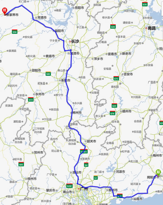 現(xiàn)在位置:張家界旅行社->交通指南->自駕車路線 -> 揭陽(yáng)到張家界旅游自駕車線路,揭陽(yáng)去張家界自己開(kāi)車要多長(zhǎng)時(shí)間,有多少公里