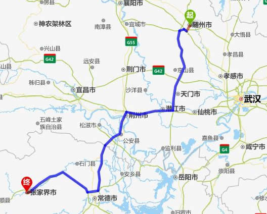 左右,沿途經過隨州——天門市——潛江市——荊州市——公安縣——澧縣——常德(也可以走國道經澧縣、石門縣)——慈利——張家界。
